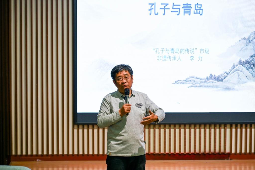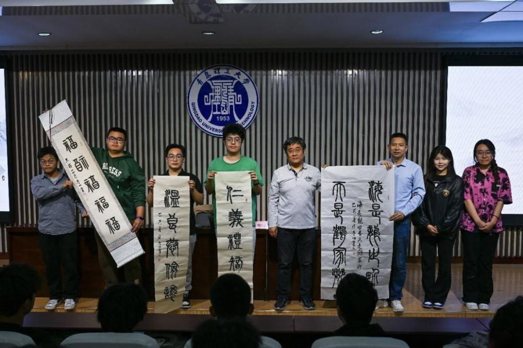 5月23日,学院特邀“孔子与青岛的传说”市级非遗传承人、青岛南园孔子纪念馆馆长李力,带来“孔子生平及教育实践”专题报告。学院学工办主任、团委书记王俊富与300余名学生共同聆听。李力以端午食粽习俗为引,巧妙串联《论语》经典,从儒家思想核心“仁、义、礼、智、信”切入,结合南园孔子纪念馆历史,讲述儒学文化在青岛的传承故事,揭示端午民俗与儒家思想同源的精神密码。现场,同学们围绕传统文化创新发展踊跃提问,李力结合“非遗进校园”实践,鼓励青年以专业特长助力文化“破圈”。讲座尾声,其创作的“仁义礼智信”“温良恭俭让”书法作品惊艳亮相,引得师生赞叹。同学们感慨,这场讲座打破了传统文化“晦涩”的固有认知,更明晰了青年传承文化、让经典“活”在日常的使命担当。
