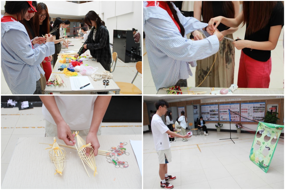 5月29日,学院在建筑馆三楼中厅举办非遗体验活动。同学们沉浸式体验了五色绳编织、竹编玲珑挂件制作等非遗技艺。他们用五彩丝线编织端午彩绳,五色丝线在大家的指尖穿梭交织,一根根彩绳在耐心与巧思中,成为寓意安康的精美手绳;在志愿者的示范下,同学们学习基础的竹篾处理与编织技法,用竹条制作玲珑挂件,将对同学的祝福融入每一件手工作品中;“张弓引矢,祛毒迎祥”射五毒活动吸引了众多同学参与。大家手持沙包,瞄准绘有蛇、蝎、蜈蚣等“五毒”形象的趣味靶标投射,在欢声笑语中直观体验了古人驱邪避疫、祈求安康的传统民俗智慧,现场气氛欢腾热烈。