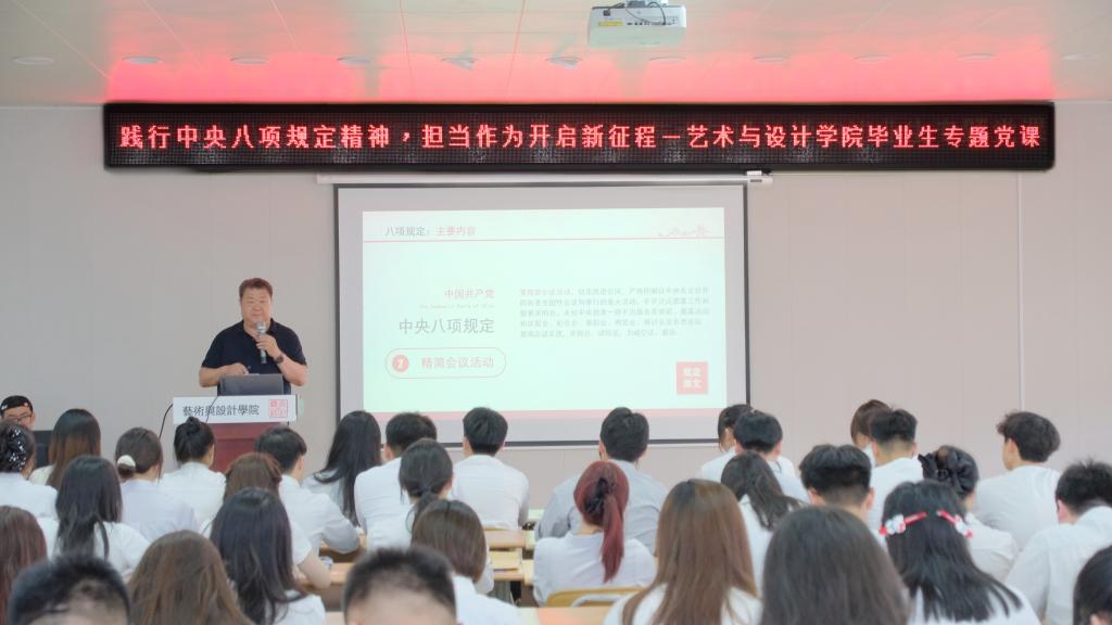 为深入学习贯彻习近平新时代中国特色社会主义思想,教育引导毕业生党员强化纪律意识、弘扬优良作风,6月16日下午,艺术与设计学院党委书记孙波以“践行中央八项规定精神,担当作为开启新征程”为主题,为全体毕业生党员讲授离校前“最后一课”,勉励青年党员以清正廉洁、担当实干的精神风貌迈好人生每一步。专题党课由学院副书记、副院长张恬主持,全体学生党支部书记、辅导员和学生党员参加。