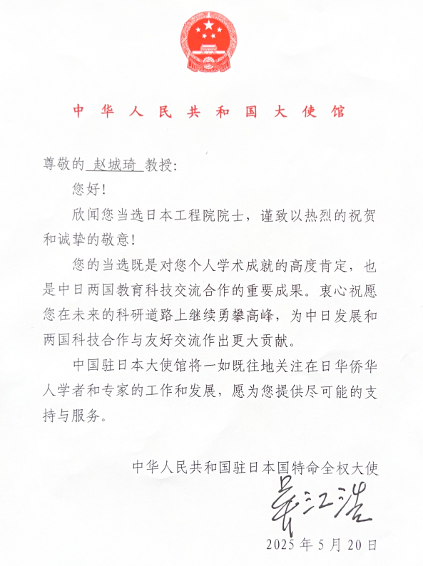 近日,我校建筑与城乡规划学院建筑学94级校友赵城琦教授,入选为日本工程院外籍院士。鉴于其在中日两国都市/建筑学界及相关实践领域所做出的重要贡献,中国驻日大使馆吴江浩大使向其致亲笔签名贺信,祝贺其当选日本工程院院士(都市/建筑):“赵城琦博士当选日本工程院院士,体现了日本学术界对其长期专业耕耘的高度肯定,对此致以热烈的祝贺与诚挚的敬意”。