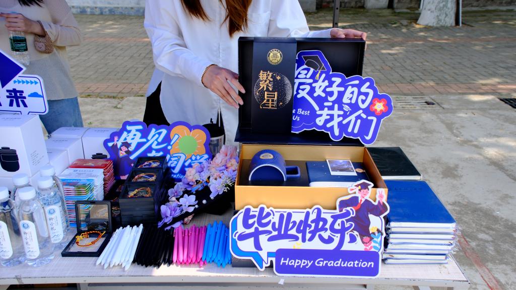 与非遗的厚重相映成趣,毕业季跳蚤市场洋溢着青春别离的温情与绿色循环的活力。即将离校的毕业生们精心摆放书籍画具、手工艺品、设计作品、实用小物等承载校园记忆的“旧宝藏”。同学们穿梭其间,不仅以实惠价格淘得心仪好物,更在交流中传递着惜物情怀与同窗情谊。市场特设“旧物改造角”,艺院学子现场展示旧衣改制、废料再造的妙招,赋予闲置物品全新艺术生命,生动诠释“焕新生”的环保理念。