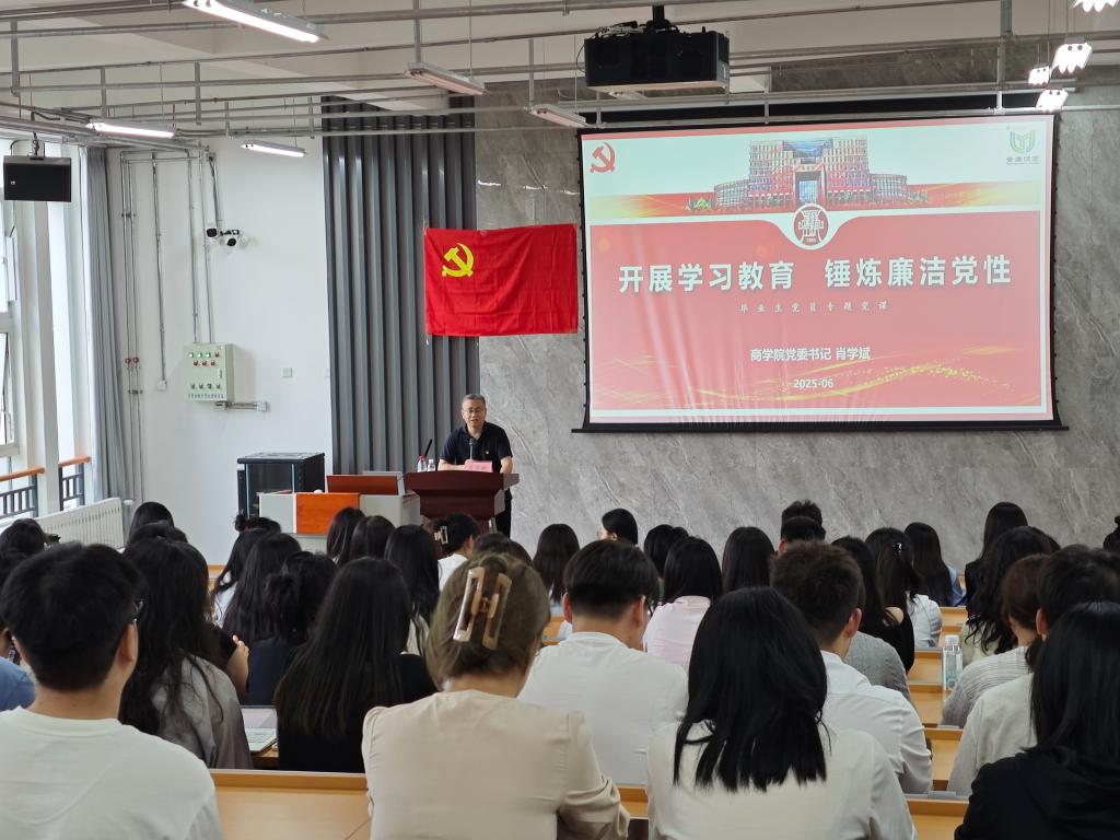 铸魂赋能,党性教育筑牢信仰之基。商学院党委书记肖学斌以“开展学习教育,锤炼廉洁党性”为主题,为毕业生党员带来一堂兼具理论高度与实践深度的专题党课。肖学斌以鲜活案例与殷切嘱托,勉励毕业生党员在新征程中勇做追梦者、奋斗者与廉洁表率。他向每位党员赠送“红心续航笺”,这份承载着入党誓词、激励箴言与校徽印记的特殊礼物,不仅是毕业留念,更成为敦促党员终身锤炼党性的“精神火种”。
