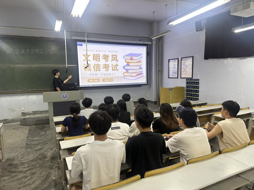 严明考纪,筑牢诚信之基。临近期末考试之际,学院辅导员、班主任组织各班级相继召开诚信考试主题班会,带领学生重温学校考试规章制度,剖析学术不端行为的严重后果,并组织学生签署《诚信考试承诺书》,加强对学生的纪律教育和诚信教育,对考试作弊行为的界定标准、相应处分措施进行详细解读,引导学生以诚信态度认真备考。
