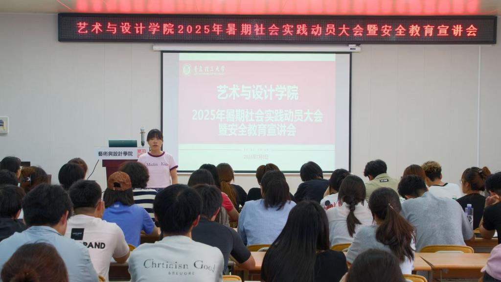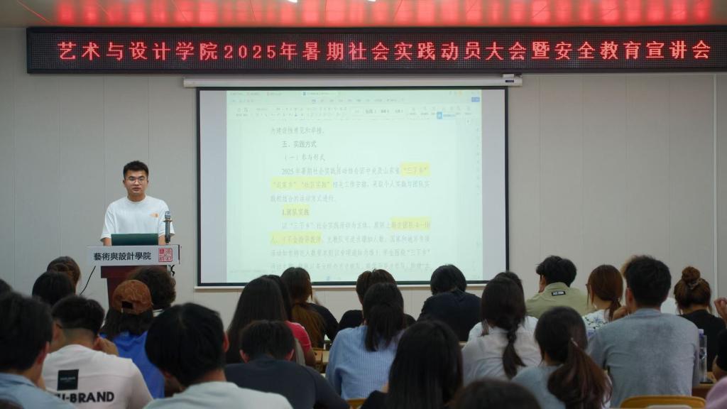 为保障2025年暑期社会实践的顺利进行,引领广大青年学子在躬身实践中受教育、长才干、做贡献,7月4日,艺术与设计学院在红楼416会议室组织开展2025年暑期社会实践动员大会暨安全宣讲会,学院团委书记袁俊霞以及各年级学生骨干近100人参会。