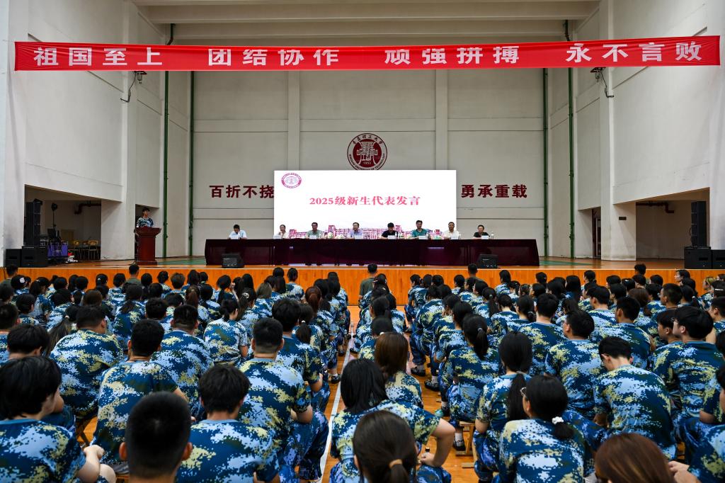 青春担当,强国有我。大会进入军训动员阶段,王俊富老师首先宣读了2025级学生军训团编制序列及教官分配名单,明确了各连排编制和训练要求。随后,2025级新生代表姜兴轩上台发言,他代表全体参训学员庄严承诺:将严守纪律、磨砺意志,以最饱满的热情投入军事训练,展现土木学子昂扬向上的精神风貌。