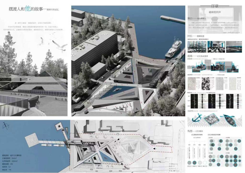 我院潘建成同学的作品以“摆渡人和他的故事”为题,提出“记忆重组”的设计概念,回应城市更新语境下人们对过往历史与场所精神的感知重构。设计从四类“记忆碎片”出发——正常记忆、关键记忆、可能记忆与遗忘记忆,运用“重组”逻辑进行空间语言转译。场地被理解为一个层层推进的记忆容器,观者在四章叙事中穿行——序章唤起、过章重构、续章生长、终章沉淀。空间序列引导观者在碎片、缝隙与交错中展开身体记忆的再书写,形成理性与感性交织的建筑体验,构建一个既承载过往又启发当下的文化地标。傅旭威同学的参赛作品以“走!去里院耍”为题,伙伴的一声吆喝,不仅是运动的邀约,更是老青岛邻里社交方式最质朴的呈现。在钢筋混凝土林立,公众活动场合受到挤压的今天,场馆摒弃了专业场馆的距离感与功利性,以一声邻里招呼般的亲切呼唤——“走!去”,宣告空间的绝对开放与零门槛,引导人们回到传统里院生活中的情感锚点,鼓励所有人即刻运动、轻松融入。 在这里,“院”不仅是三角柱廊围合出的物理院落,更是指向一种温情、包容、归属感的社区精神,回归最纯粹的生活享受与人际互动。