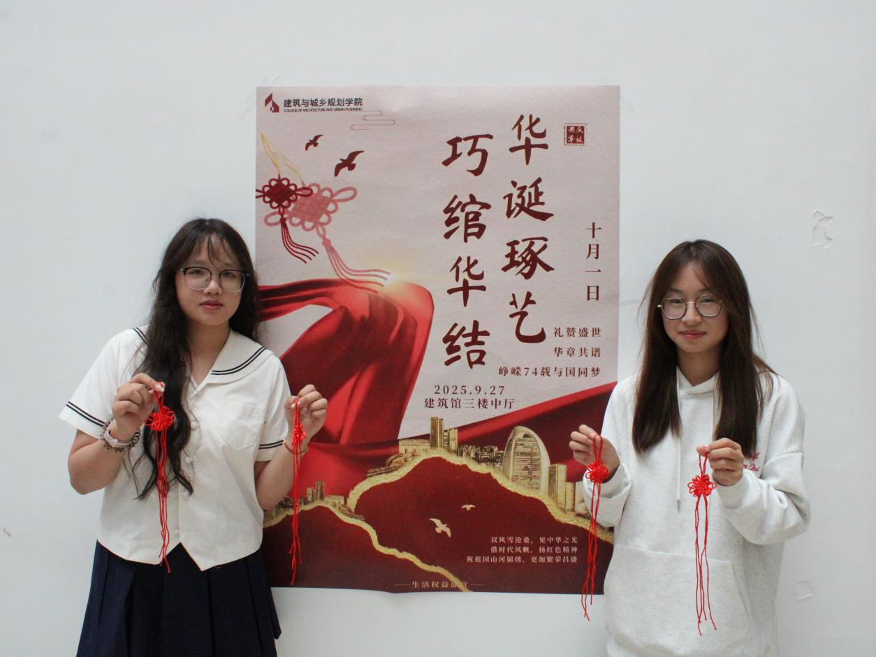 9月29日,学院在建筑馆三楼中庭举办“传承的力量”建筑模型制作活动,活动现场,同学们神情专注地投入到天安门广场、人民英雄纪念碑等标志性建筑模型的拼接与制作中。大家独立构思、团队协作,不仅锻炼了专业实践能力,更深刻感悟到这些建筑所承载的民族记忆与历史厚重感;在“巧绾华结”手工活动中,同学们将一根根饱含祝福的红绳,编织成寓意吉祥团结的中国结,这不仅是一次传统手工艺的体验,更是一场生动的爱国主义情感教育,让浓浓的爱国情怀在指尖流转、心中生根。