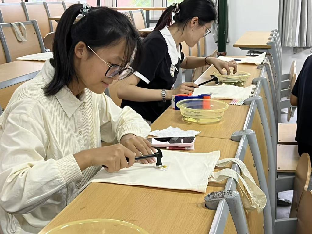 植物拓印是一种古老的非遗技艺,以植物根、茎、花、叶为天然印材,通过锤击将汁液渗透至布料或纸张,形成独特图案。绿丝带健心协会的志愿者们提前准备好帆布包、纺织颜料、橡胶锤、宣纸等丰富材料,带领同学们走进校园,拾取形态各异的落叶。在学习了拓印的基本步骤和技巧后,大家精心挑选自己喜爱的落叶,小心翼翼地在其叶脉清晰的一面涂上心仪的颜色,然后将叶片仔细地放置在帆布包上,后用手或小锤均匀按压。当叶片被轻轻揭开,一片片秋叶的轮廓与细腻的脉络便完美地复刻在织物之上,形成一幅幅独一无二的自然画作,将自然之美与家国情怀、团圆之意紧密相连。