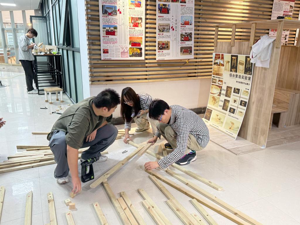 开幕式结束后,各参赛团队迅速投入到紧张的现场搭建环节。选手们分工明确,测量、切割、搬运、组装,节奏紧凑而有序。从结构推敲、节点优化、材料整合、空间营造,每一处细节都凝聚着学生团队的专注与协作。现场气氛十分热烈,充分展现出青年学子扎实的专业能力与昂扬的创新风貌。