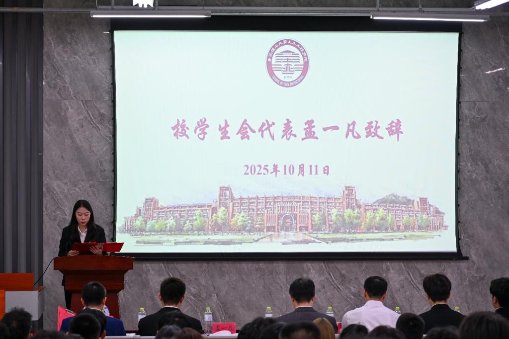 王鹏飞代表学院党委讲话,他对过去一年学生会、研究生会的工作表现给予了充分肯定。他表示,新一届学生会、研究生会要以习近平总书记关于青年工作的重要论述为指引,筑牢思想根基,强化服务意识,在推进学院高峰学科建设、助力学校高质量发展中展现土木青年的担当,并希望全体同学将个人理想融入国家发展伟业,坚定理想信念,为中国式现代化建设贡献青春力量。