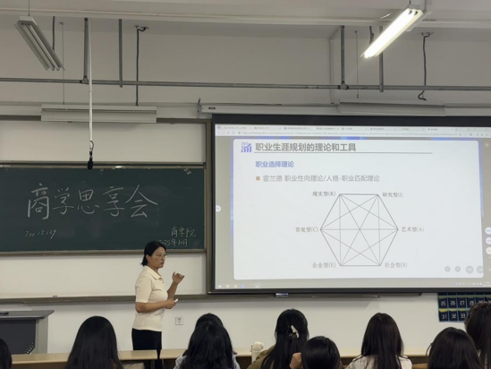 分享会上,张真真以职业生涯规划的概念与意义为切入点,系统梳理职业选择与发展的经典理论,深入拆解规划流程与实用工具,为同学们搭建完整的职业生涯规划知识框架。她首先明确,职业生涯规划是持续的系统性过程,需在全面认知主客观因素基础上确立目标、落地行动;随后重点讲解帕森斯“特质-因素理论”、霍兰德“职业性向理论”、施恩“职业锚理论”及弗鲁姆“择业动机理论”,帮助同学们洞悉职业选择的底层逻辑。在理论讲解后,张真真结合职业生涯规划“自我剖析、机会评估、目标制定、路径选择、行动实施”的五大关键步骤,为同学们提供了实用工具指南。她特别强调,自我剖析需结合心理测评、能力模型等工具全面认知自我,机会评估则要深入探索外部环境因素,实现个人优势与社会需求的精准匹配。