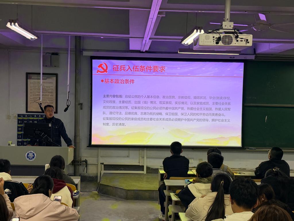 于文盛系统讲解了大学生应征入伍的流程,从网上报名、初检初审、体格检查、政治考核,到役前教育训练、审批定兵、新兵起运,每一个环节都进行了细致入微的讲解,为有志参军的同学勾勒出一条清晰的“军旅路线图”。他针对政策待遇、经济待遇等最新政策进行详细解读,尤其是同学们关注的学费补偿、退役后复学转专业等优待措施以及退役后在升学就业等方面的利好措施。政策的“干货”解读,消除了同学们对参军的诸多疑虑,让他们感受到国家对高素质兵员的渴求与关怀,让同学们清晰了解参军的路径与价值。