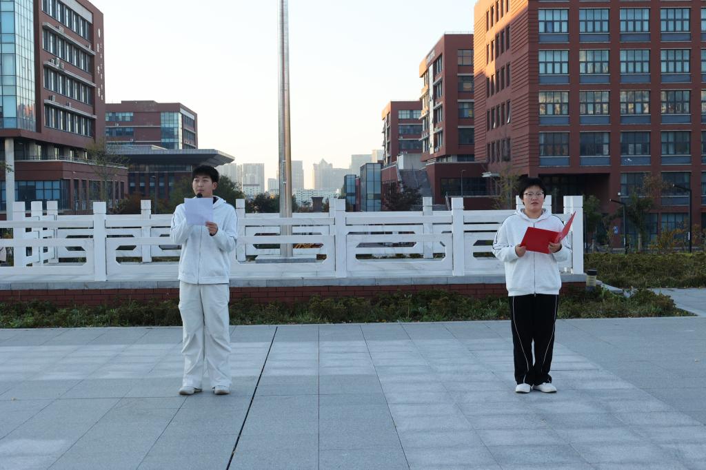 升旗仪式在庄严的国歌声中开始,五星红旗冉冉升起,全体师生肃立注目。随后,学生代表马浩业作国旗下演讲,以“赤子之心护山河无恙,做环境学子的新时代爱国担当”为主题,结合当下的时事政治,与同学们分享感悟。