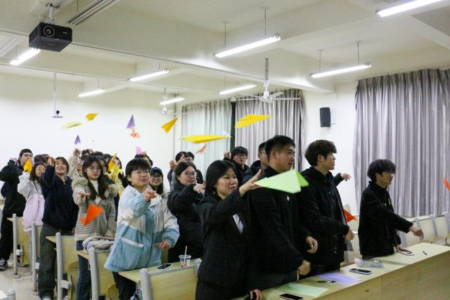 纸鸢寄愿承团志,云帆载梦展青锋。11月4日,土木工程学院组织全体团支书开展空军建军节主题论坛。论坛现场,团支书们围绕“新时代青年与国防建设”展开讨论,结合空军发展历程分享感悟,在思想碰撞中深化对国防重要性的认知。城地241班潘佳奉说道:“空军从无到有、从弱到强的发展历程,是国家崛起的生动缩影。作为新时代青年,我们既要仰望蓝天致敬英雄,更要立足专业岗位练就过硬本领,用实际行动为国防建设添砖加瓦。”在“纸飞机寄初心”互动环节中,团支书们在彩纸上写下对空军战士的祝福与对祖国蓝天的美好期许,轻轻掷出的纸飞机在空中划出优美弧线,既呼应了空军建军节主题,更让青年学子的爱国情怀在实践中转化为担当力量。