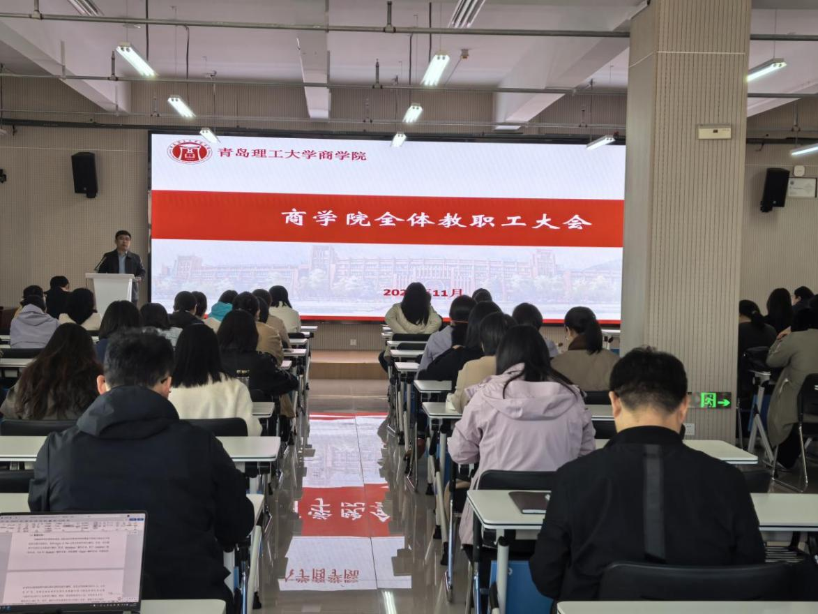 11月12日,商学院在学院楼401报告厅组织召开全院教职工大会,学习传达学校有关会议精神,全面总结近期工作,并就未来重点任务进行部署。会议由商学院院长云乐鑫主持,学院党委书记肖学斌及领导班子成员、全体教职工参加会议。