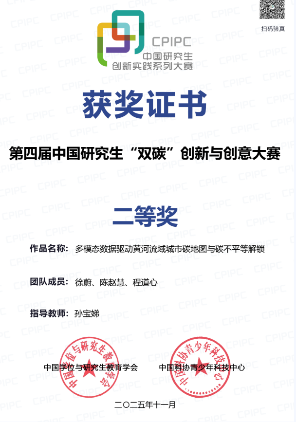 建筑与城乡规划学院获奖作品《多模态数据驱动黄河流域城市碳地图与碳不平等解锁》,聚焦黄河流域特大城市,通过多模态数据构建高精度碳地图,解析碳排放与社会经济之间的内在关联,实现“碳地图”与“碳不平等”政策解锁。旨在制定一份兼顾碳公平与碳中和的特大城市最优脱碳路径,为其他特大城市碳减排提供参考,促进黄河流域低碳发展,从而高质量、公平实现“3060”双碳目标。作品在服务国家“双碳”战略、探索高质量可持续发展路径上的重要价值,赢得了评审专家的一致认可,最终荣获全国二等奖。