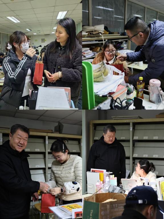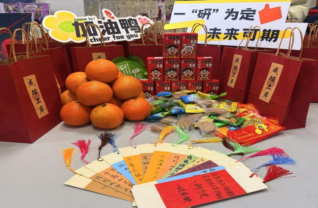 活动现场暖意融融,学院精心筹备的“考研助力大礼包”成为传递温情的重要载体。礼包内不仅包含寓意“心想事‘橙’”的橙子、补充能量的牛奶与巧克力、驱散寒意的暖贴,更有学院老师亲笔书写考研寄语书签,每一份礼物都凝聚着师生同心的创意与温情,让物质关怀与精神鼓舞双向赋能。“看到大礼包和老师的祝福卡片,瞬间感受到了‘艺院大家庭’的温暖,备考的疲惫都消散了不少。”一名接过礼包的学生感动地说。