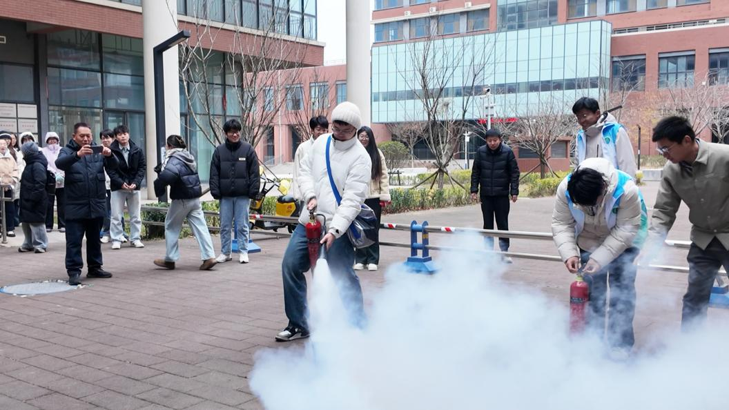到达指定安全区域后,活动进入消防器材使用教学环节。消防科负责老师和郝田宇老师现场向同学们示范灭火器的正确操作方法,包括拔掉保险销、握住喷嘴、对准火源根部喷射等步骤。随后,学生代表依次进行实操体验,在烟雾点燃组配合下使用灭火器对模拟火源进行扑灭。同学们积极参与,现场氛围热烈,不少学生表示首次进行灭火器实战,更直观地理解了消防器材的重要性和使用技巧。