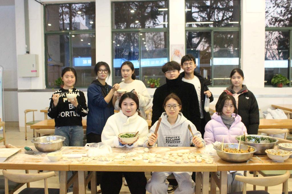 包饺子活动现场一派暖意盎然,大家围在桌前挽起袖子,分工协作。熟练的同学手法娴熟,取皮、填馅、捏褶一气呵成,包出的饺子饱满挺立;初次尝试的同学则细心观摩,从捏合边缘开始学起,在同伴的指点下逐渐掌握技巧,从略显生疏到渐入佳境,形态各异的饺子承载着欢乐与祥和,在互动协作中把冬至的热闹,揉进了每一个动作里,每一个饺子,都藏着独属于冬至的心意。
