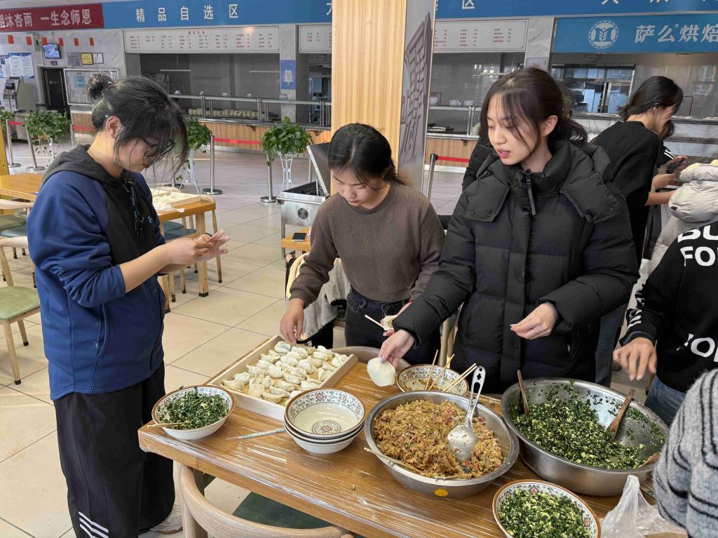 在包汤圆区域,学生负责人首先为同学们讲解了冬至的民俗文化内涵,随后进行汤圆制作示范,从和面、搓馅到成形,细致讲解技巧与要领。同学们专注聆听,跃跃欲试,南北方学子互相分享着家乡的冬至习俗。在实践环节,大家分组协作,揉粉、包馅、搓圆,虽手法生疏却充满热情,现场笑语盈盈,暖意融融。不一会儿,一颗颗雪白滚圆的汤圆在指间诞生,摆满了餐盘,在“圆”与“饺”的对话中,加深了对传统文化的理解。