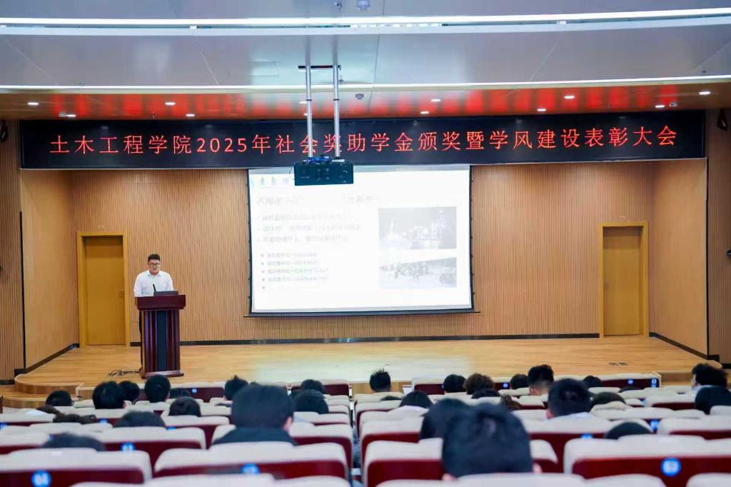 土木工程学院副院长孙林娜宣读《土木工程学院关于表彰2025年学风建设先进集体、先进个人的决定》。郭建锋和企业代表、学生处领导、学院领导分别为先进集体和优秀个人颁发锦旗和荣誉证书。