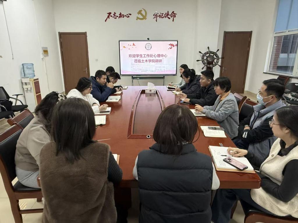 12月30日下午,学校大学生心理健康中心刘安庆主任、薛腾飞老师、辛雪梅老师莅临土木工程学院开展调研,学院学工办主任、团委书记王俊富、“心动力”辅导站心理咨询师房玉佩、各年级辅导员参加调研。会议围绕如何推动学校、学院心理健康工作走深走实,进一步充分发挥心理健康教育在“一站式”社区中的育人作用等问题展开深入交流研讨。