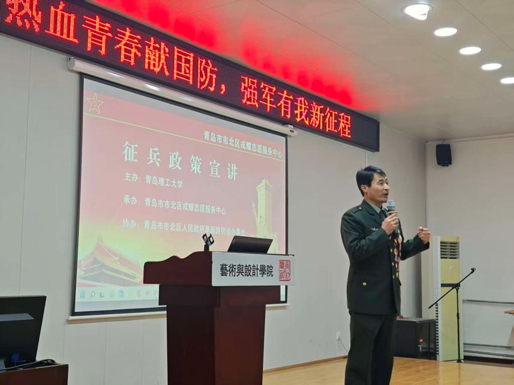 为进一步激发大学生参军报国热情,引导青年学子将个人理想融入强国强军伟业,2026年1月8日,征兵政策宣讲会于艺术学院报告厅顺利举办。本次宣讲特邀市北区戎耀志愿服务中心主任李积伟、青岛司法局党建指导员、警备区教练员刘建新主讲,各年级学生代表参与活动。