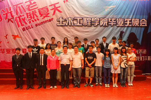 6月25晚,土木学院“青春不老 依旧夏天”2015届毕业生文艺晚会在市北校区礼堂举办,学院党总支书记张明义、党总支副书记邹传波、副院长曲成平、毕业生班主任代表以及400余名2015届毕业生到场观看了演出。
