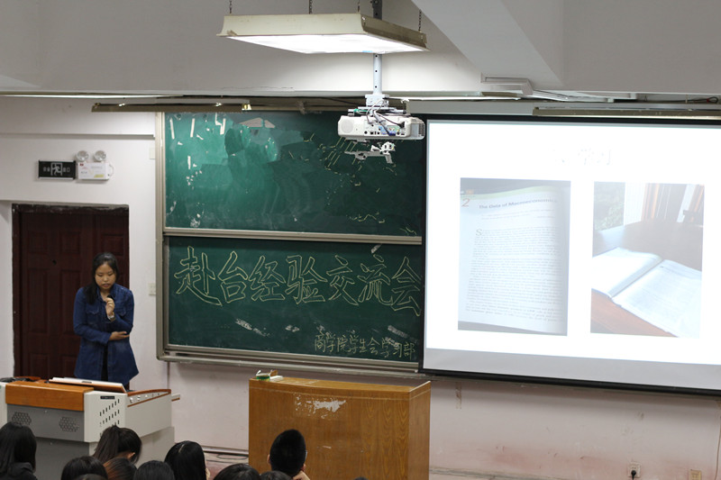 活动开始后,首先由潘艺林同学作交流,她从读书、旅行、学术三个方面分别介绍自己在台湾暨南大学交换学习期间的心得体会以及赴台前准备和注意事项,其中着重介绍了学校的图书馆以及一些有趣的课程等。随后周佳同学介绍了台湾的风土人情,同时谈了自己的交流生活学习经验。从现场展示的照片中可以看出她们在台湾的学习生活很充实,通过她们的介绍,帮助有意向准备赴台湾高硫交流学习的同学了解了赴台交流的更多事宜。