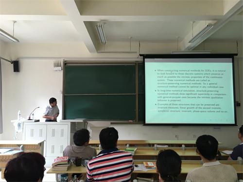 应理学院邀请,7月17日上午,哈尔滨工业大学理学院博导丁效华教授来我校理学院为数学专业师生做学术报告。报告在嘉陵江路校区B219进行,副院长胡京爽主持,党总支书记肖学斌、院长于进伟参加。报告题目:Invariant-preserving numerical methods for stochastic differential equations。