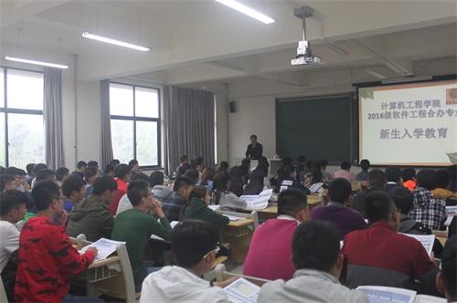 10月9日下午,计算机学院在嘉陵江路校区主教学楼B424举办了“软件工程”合办专业新生入学教育讲座。青岛软件园人力资源服务有限公司总经理李战军、学院党总支书记杨欣虎、党总支副书记魏俊文、团总支书记张英华等出席了本次讲座。