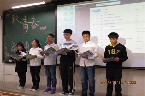 为了弘扬校园青年精神,汽车与交通学院于10月12日晚在主教学楼B404举办“致青春”朗诵比赛。大一学生代表参加了此次朗诵大赛。