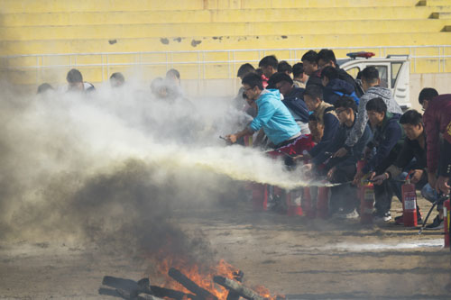 一阵急促的警报声拉开了演练的帷幕,随着楼前浓烟冒起,宿舍负责人抛出用床单自制的绳索于宿舍待命,参加演习的同学从公寓楼内跑出,用湿毛巾捂着口鼻,弯着腰,快速有序地撤离到楼下东侧空地。其间还有医疗救护组手持医疗装具,模拟救护从楼内运送出“伤员”。随后,同学们在运动场集合并学习消防知识。保卫处杨志勇老师为现场师生以及公寓管理人员介绍消防器材的基本知识和灭火器的使用方法。在保卫处人员的指导下,同学们学习了灭火器的使用,对防火、灭火有了更深的认识。最后,同学们在引导人员的指挥下依次离开田径场,本次演练圆满结束。