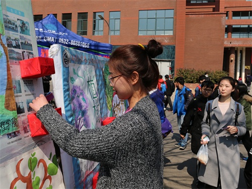 与此同时,学生会举办了以植树节为主题的海报评比活动,组织各个学院绘制绿色海报,并在二食堂门口举行评比,让大家为自己喜欢的海报投票,在制作的横幅上签下自己的名字,树立绿色环保的观念,期间还组织了抽奖活动,向同学们派发花种,绿色书签。
