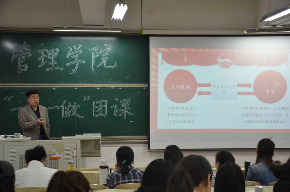 4月19日下午2点,管理学院“一学一做”主题团课在二教409教室举行。管理学院团总支书记于利俊主讲,学生会各中心主任、部长和各班级团支部书记参加了本次活动。
