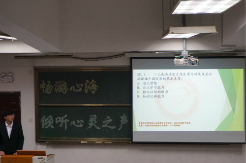 本次活动分为心理知识抢答和观影两个环节。参赛者以小组的形式进行单选、多选和论述题的抢答。抢答环节紧张而秩序井然,参赛者沉稳答题。随着抢答的进行,题目难度逐渐加大,竞争也越来越激烈。活动间隙,心桥社干事给大家带来的情歌对唱、诗朗诵等节目缓解了竞赛紧张的气氛。论述题内容丰富,覆盖面广,从人际交往到恋爱观,还有如何科学地完善自我等问题,同学们也都各抒己见,积极阐述自己的观点。随后,活动进行第二环节:观看心理影片《苍蝇的一分钟生命》,并由同学们写下自己观影后最真实的感受。最终,第四组同学获得第一名;第一组同学获得第二名;第五组同学获得第三名。
