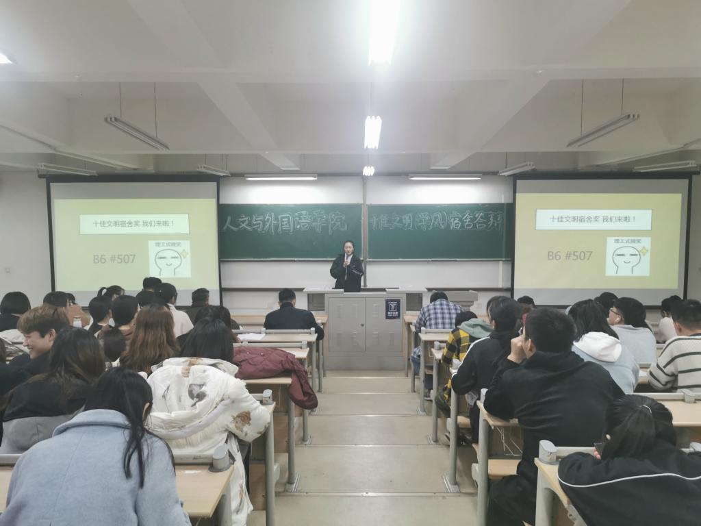 为深入贯彻落实“美丽校园”建设工作,丰富我院学生公寓文化内涵,加强学生公寓文化建设,充分发挥学生公寓文化育人功能。11月20日下午,人文与外国语学院在嘉陵江路校区主教学楼B225教室举办了2019年院级十佳先优宿舍答辩会。担任本次答辩大会的评委有人文与外国语学院党总支副书记王振,学工办主任、分团委书记马松,辅导员辛雪梅、贾舒文、王才升,会议由贾舒文主持,各年级学生代表参加此次答辩会。