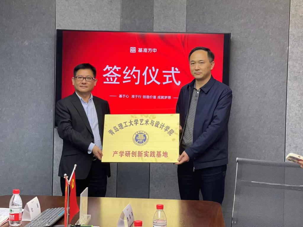 郭建锋一行首先参观走访了基准方中建筑设计有限公司青岛分公司,在座谈交流中,公司总经理税勇对企业的发展状况、企业文化、核心优势、用人需求等进行了全面的介绍,重点强调了与学院环境设计专业岗位相关的景观事业部与室内设计部的发展、技术能力等内容。郭建锋从学校的发展历程,办学成效、人才培养方面进行了介绍,希望校企双方能借助基地建设,加强沟通交流,发挥各自优势,实现资源共享,推动产教融合,深化协同育人,共赢发展。孙波详细介绍了艺术与设计学院的学科专业建设、专业特色及人才培养情况。双方针对校企合作展开了深入交流,围绕人才培养、创新创业实践基地科学化建设以及疫情之下行业就业趋势等内容进行了深入探讨。会后,双方签订了就业创业实践基地合作意向书,举行产学研创新实践基地揭牌仪式。