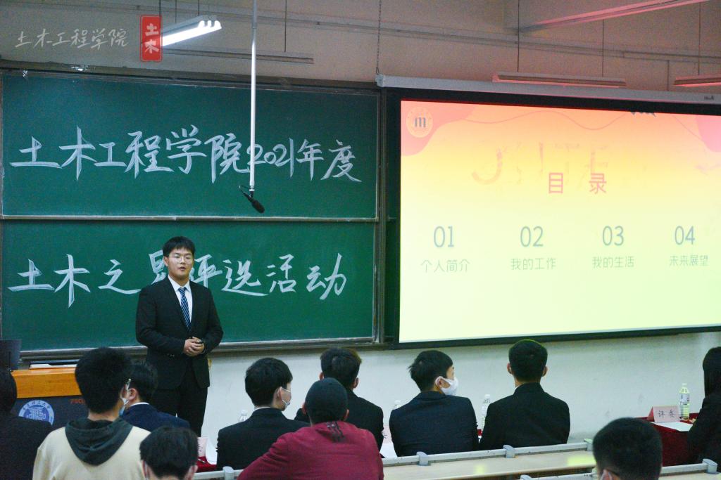 本次“土木之星”评选活动共有34名来自学生会各个部门以及社团的选手参赛,每位候选人在五分钟时间内结合PPT,对本学期工作开展情况以及自己的大学生活感悟进行汇报,然后由现场评委进行提问。候选人都以满腔热情表达了自己积极的工作态度和身为学生干部肩负的责任,表达了对学生工作的热爱,清晰明了地回答了评委们的问题,阐述了自己对于学生会工作的认知和经验,分享优秀活动的经验,查找工作中的不足。经过紧张激烈的答辩,10名同学脱颖而出,获得了本年度“土木之星”荣誉称号。张家乐进行了总结,向大家表达了祝贺,对他们的未来发展给予了更高的期望,希望“土木之星”们继续发挥自己的光和热,在青年学生中传递正能量,引领广大同学勇于进取、奋力拼搏,用奋斗书写无悔的青春答卷。