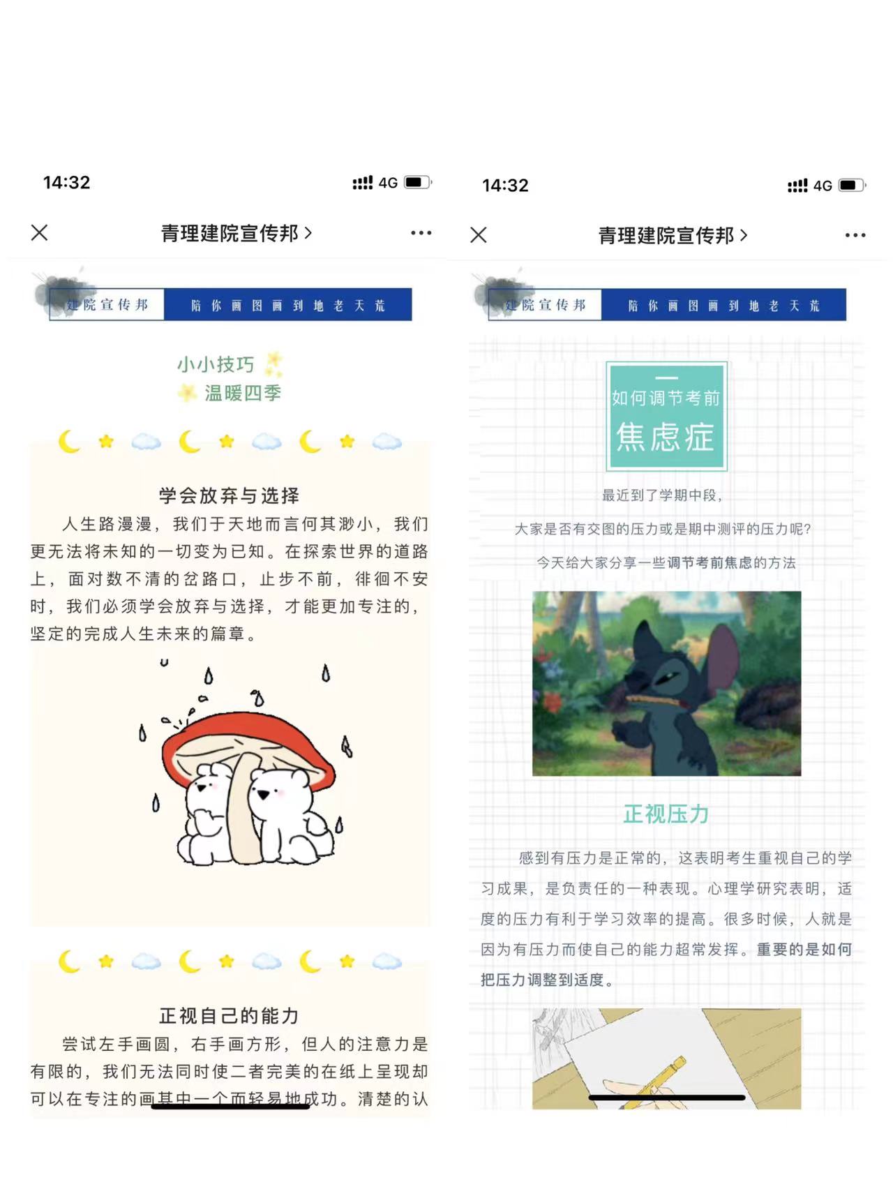 春日暖语,滋润我心。学院近期通过微信公众号青理建院宣传邦推送“小小技巧成就更好自己”、“如何缓解考试压力”等心理健康小贴士,以图文结合的方式向学生普及心理健康知识,发布心理调适指南与方法,让学生在闲暇之余涨知识,增见识。