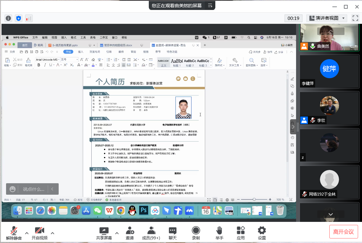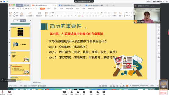 为全力做好疫情防控期间的就业指导工作,提升学生就业竞争力,信息与控制工程学院频出实招,积极拓宽线上渠道,多举措协同育人促进就业。我院于2022年5月16日下午15点线上举办了“ 关于简历那些事儿”—就业指导专题讲座,助力学生打通求职路上的第一道关口。2018级、2019级学生积极参加,本次讲座特邀青软集团讲师曲美然主讲,软件工程教研室主任李壮、2018级辅导员刘荣稳、2019级辅导员逄超、软件专业驻校校企合作经理李健萍出席了此次活动。