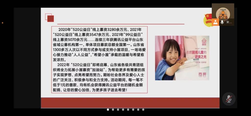 为引导青年学子积极奉献爱心助力希望小屋建设,进一步增强团员青年的社会责任感与使命感,在520公益日“希望小屋”线上募捐活动即将开始之际,管理工程学院通过线上方式开展“奉献爱心温暖 共建希望小屋”主题团日活动,学院团委书记宋晓峰、各班团员青年代表等110余人参加。