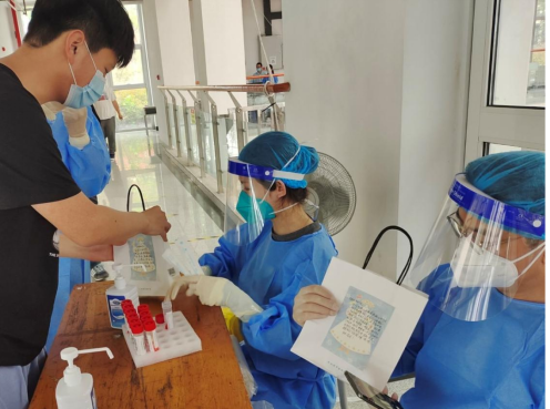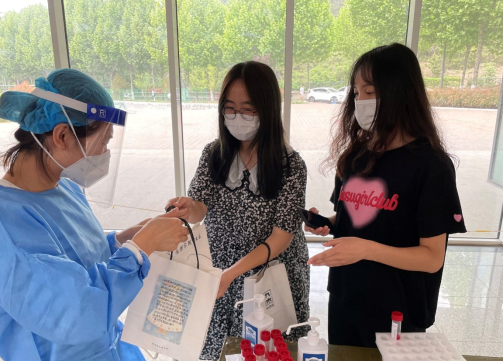 香香的粽子,热气腾腾,承载着同学们美好的祝愿。待到粽子蒸熟后,同学们认真挑选出好看的香粽装入准备好的纸袋。在每一个纸袋上面写下最真挚的祝福:“亲爱的医护工作人员和老师们,疫情遮蔽的日子,将远方阻隔,但是好在有您们的坚守。今日将我们的感谢,经由此“粽”赠予您,愿这一声祝福化成一缕清风,吹去心头的暑热;愿它化成一股甘甜的泉水,冲去心中的苦楚。谢谢您们的陪伴!”同学们将刚出炉的粽子送到了核酸检测现场、学校医务室、辅导员办公室,同时也将自己的祝福送上。通信201班曹越将粽子送到学院党委副书记曲良波手中说:“老师谢谢您,仍记得,封校期间,您跟我们一同坚守学校,有同学生病时,您和辅导员老师们总能第一时间出现在同学身边。您们是我们的老师,更是我们的家人。”