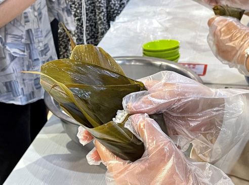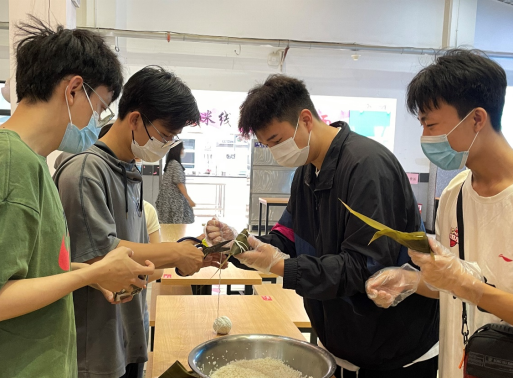 片片粽叶,粒粒糯米,裹一年健康冀望。在祥园餐厅四楼,同学们亲自动手制作,将粽叶折成漏斗形,在漏斗形的粽叶里放入适量的糯米、红枣,然后用大拇指和食指按住粽叶两边,最后把粽子用绳子绑好,放入锅中蒸煮。同学们跟着步骤小心翼翼、按部就班的操作,细线缠绕,粽叶飘香,同学们脸上都洋溢着欢乐的笑容,在浓情和睦的氛围中,香甜可口的粽子随之出炉。