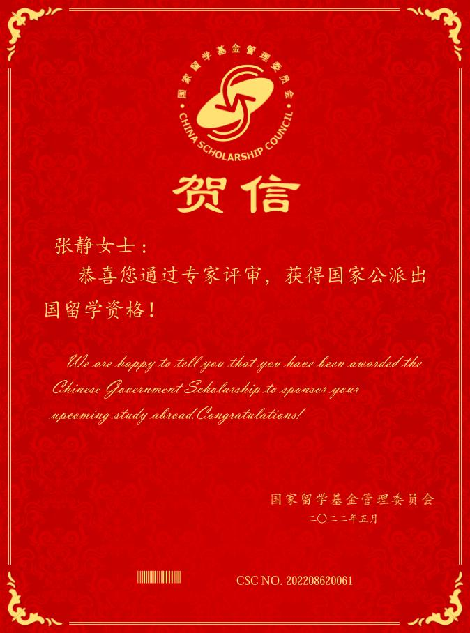 此次我校张静同学喜获国家留学基金委资助是学校教育国际化的又一可喜成果。