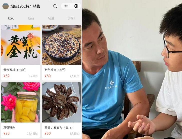 8月13日中午,实践团走访了烟庄村致富带头人伊海军,在第一书记帮助下,村中特色农产品烟庄苹果、蜜桃罐头等食品上架电商平台,拓宽了农产品的销售渠道,帮助农民获得更多的经济效益。实践团队为其制作了小程序店铺,提高其售卖效率,增加村民收益。