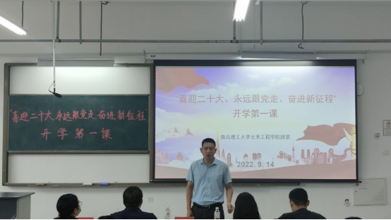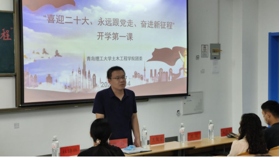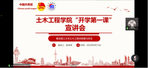 团委副书记张泽帝为22级新生组织开学第一课宣讲会,张泽帝带领新生深刻感悟习近平总书记在庆祝中国共产主义青年团成立100周年大会上的重要讲话精神,呼吁同学们听党话,跟党走。课堂呈现了一大批为祖国前仆后继,不畏险阻,牺牲奉献的革命前辈。土木229班胡冰亚表示:“正是有那么多的仁人志士,为祖国流血牺牲,才有祖国如今的繁荣,作为新时代青年大学生,应当传承弘扬先辈的大无畏精神,肩负新时代赋予的职责和使命。”