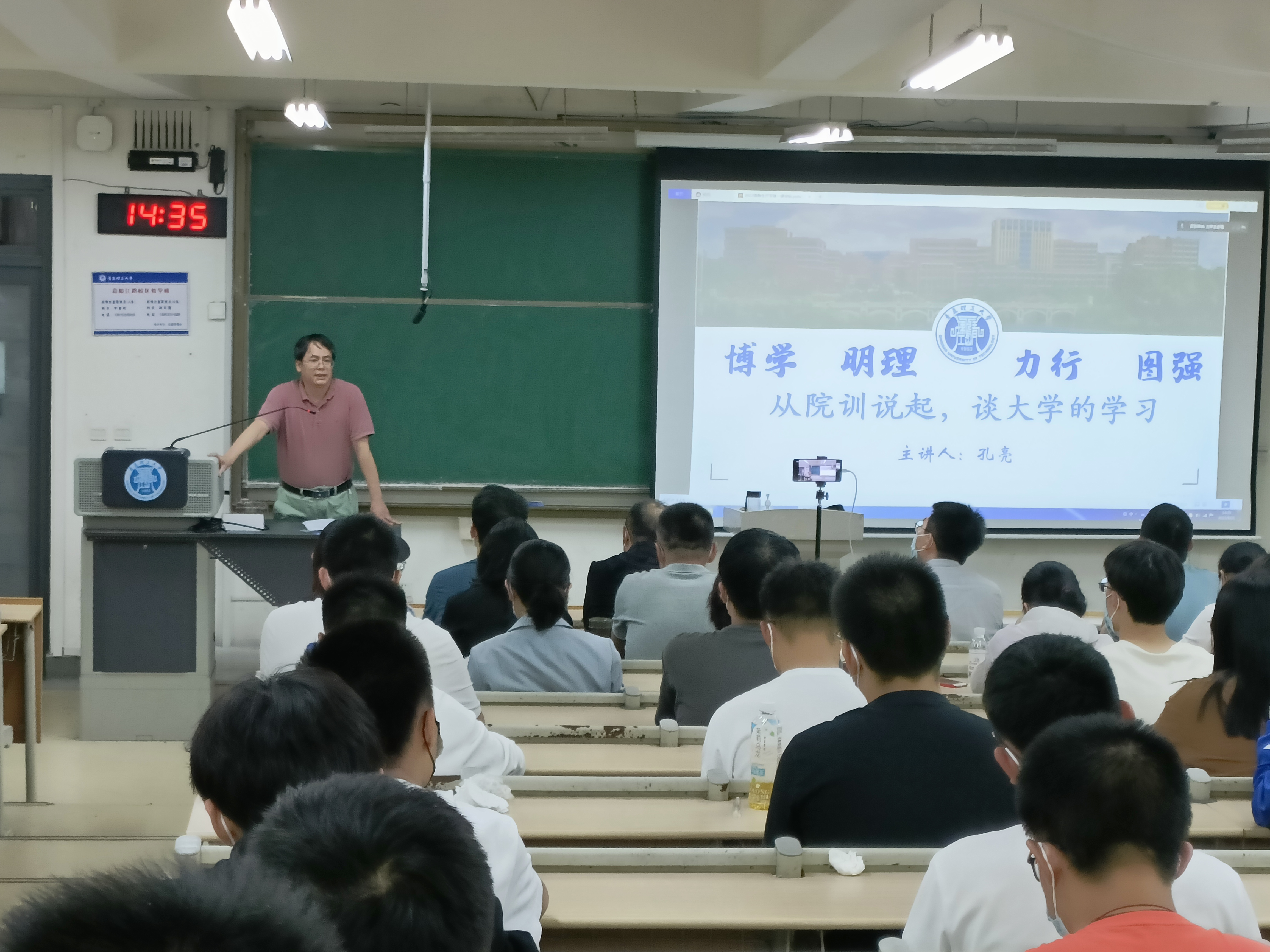 在A230教室,孔亮以“博学明理,力行图强”的院训精神解读为切入点,详细介绍了学院四个专业的基本概况、师资队伍、办学条件、课程体系等内容,让同学们深入全面了解自己所学专业的发展历程、专业特色、培养目标以及近些年取得的办学成绩。