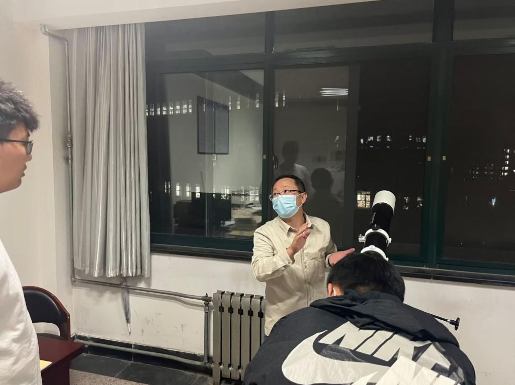 “你看到“大行星”了吗?”“让我看一眼,让我看一眼!”9月21日晚8点,主教学楼A320的阳台上传来一阵热闹的讨论声。当天上午9点,物理教研室的姜龙老师委托学院团委在第二课堂“到梦空间”发布了“探索星空”的活动预告,不到十分钟时间,30个名额被“争抢”一空。姜老师是理学院2022级应用物理专业新生学业导师,研究方向是天体物理,在今年的新生入学教育中,他一改往日枯燥的“我说你听”模式,而是把专业教育直接搬到了最“酷炫”的专业望远镜旁。“中秋节那天已经有同学在这看到了土星和木星的交会,今天来的同学也不少,都对这种形式的物理科普很感兴趣!”姜老师兴奋的说。