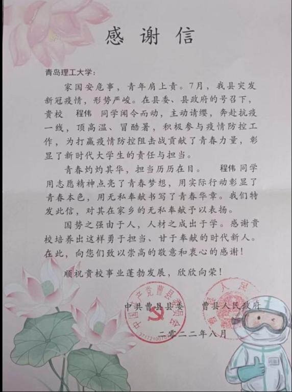 近日,一封感谢信被送到管理工程学院老师的手中。中共曹县县委对管理工程学院研2202班程伟同学在暑假期间担任抗疫志愿者的优异工作表现给予了充分的肯定与赞扬,并对管理工程学院培养出勇于担当、不怕困难的学子表示诚挚感谢。